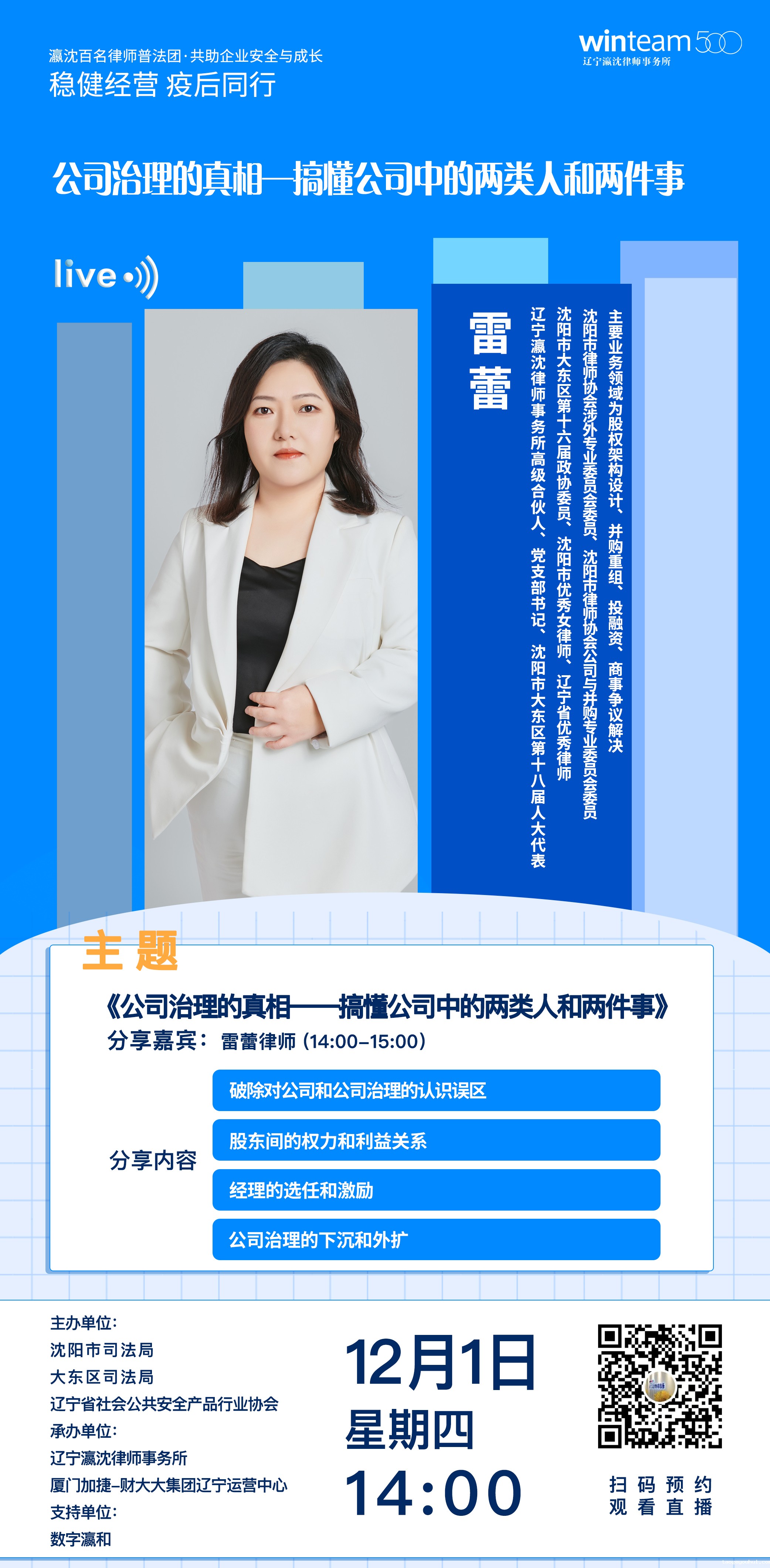 为助力协会成员稳健经营,伟德平台官网首页与辽宁瀛沈律师事务所的17支专业化业务团队、上百名律师,针对企业关心的《公司治理的真相——搞懂公司中的两类人和两件事》问题,特邀行业资深专家——雷蕾律师,为协会成员进行详细解读!