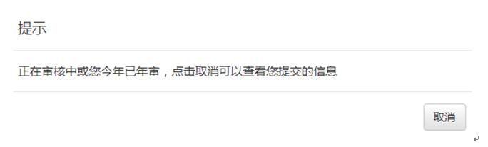 六、关于是否通过年检。在重新登录网站后会有系统提示,(如下图:正在审核中或今年已年检)如果未通过年检,系统会提示重新上传资料。