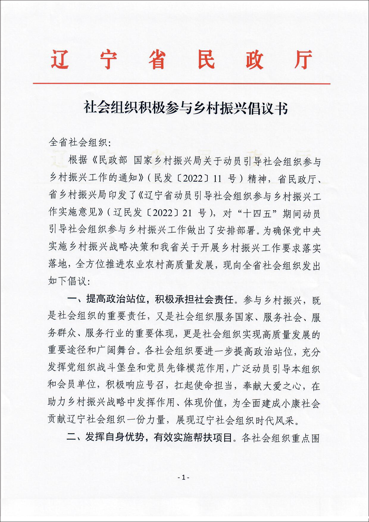 转发辽宁省民政厅《社会组织积极参与乡村振兴倡议书》